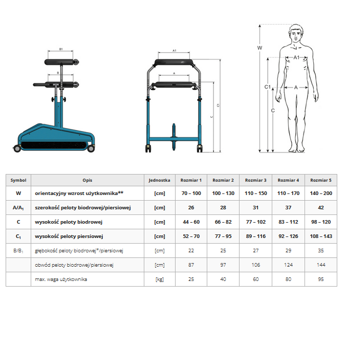 - Szeroka gama rozmiarowa sprawia, że urządzenie to znajduje odbiorców o różnym wzroście i wieku. Pozwala użytkownikom zdobywać nowe doświadczenia i prowadzić w miarę możliwości, samodzielne i niezależne życie.