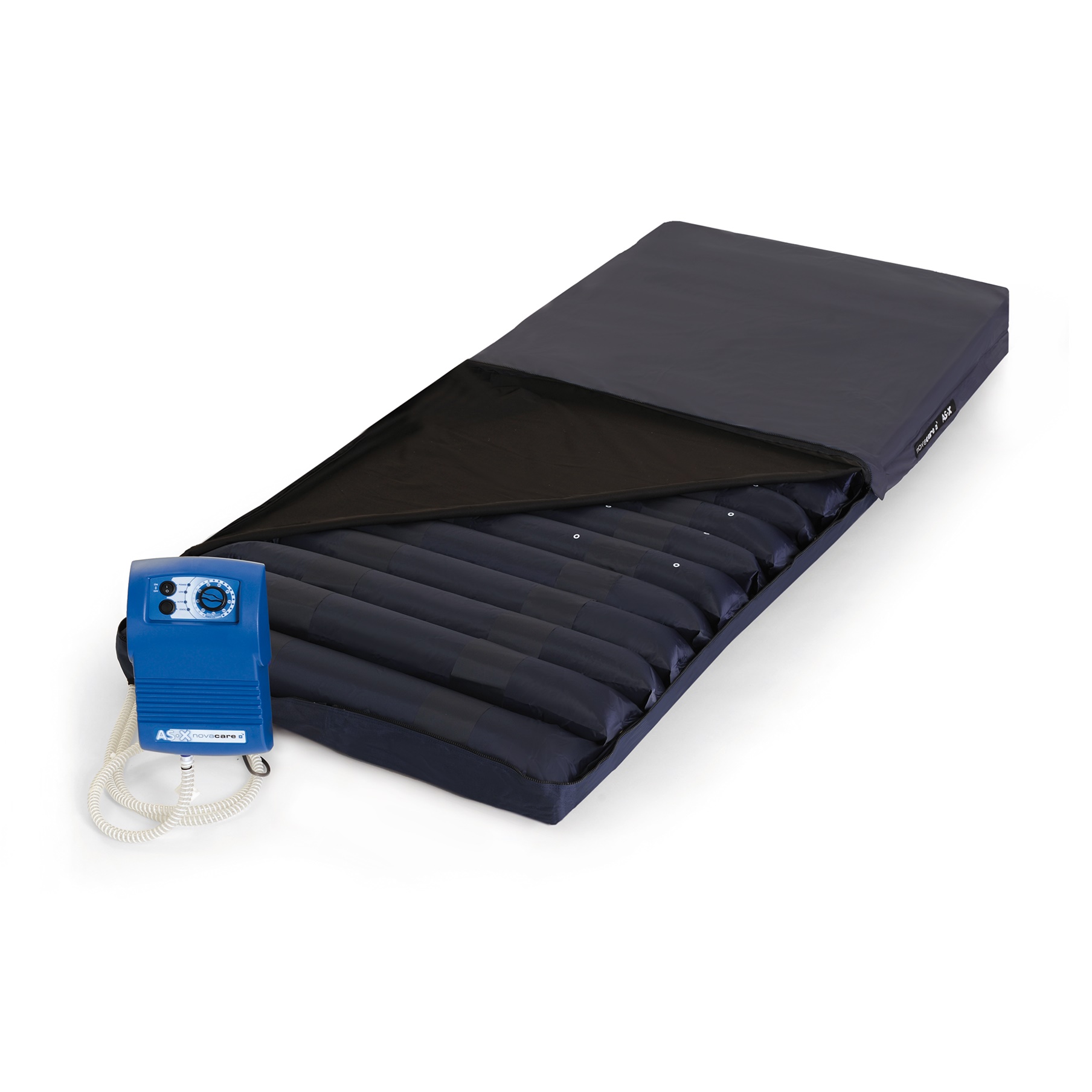 • ASX NOVACARE – wysokiej klasy materac zmiennociśnieniowy rurowy. Skuteczny przy profilaktyce i leczeniu odleżyn do III stopnia włącznie. Poszczególne komory wykonane z nylonu / PU , z których osiem jest mikro-perforowana.