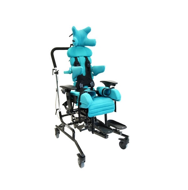 - Zbudowany jest ze stabilnej ramy jezdnej HL21 z regulacją wysokości, kół (wielkość kół do wyboru), siedziska, tapicerki, pasów stabilizujących miednicę, podłokietników, kamizelki, pelot piersiowych, pelot biodrowych, pelot przykolanowych wraz z pasami odwodzącymi, rączki do prowadzenia, podnóżka wraz z pasami do stóp.