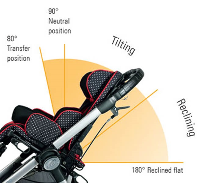 - Pozycje odchylona i półleżąca ułatwiają karmienie, trawienie, oddychanie i orientację wzrokową. Any ustawić pozycję odchyloną (zakres 350°) oraz leżącą (do 180°) w wózku Zippie Voyage, wystarczy użyć hamulca, znajdującego się za oparciem.