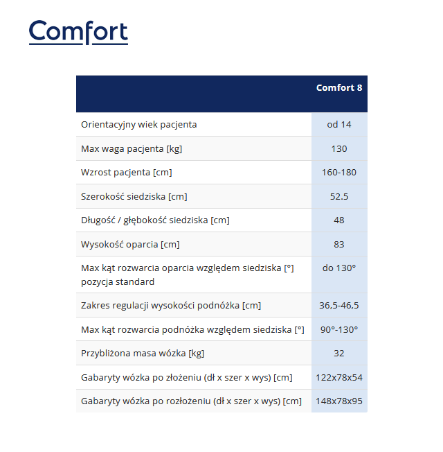 - Comfort 8 Wózek inwalidzki spacerowy dedykowany dla osób o parametrach o wzroście 160-180 cm wzrostu i wadze do 130 kg