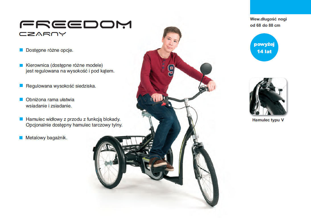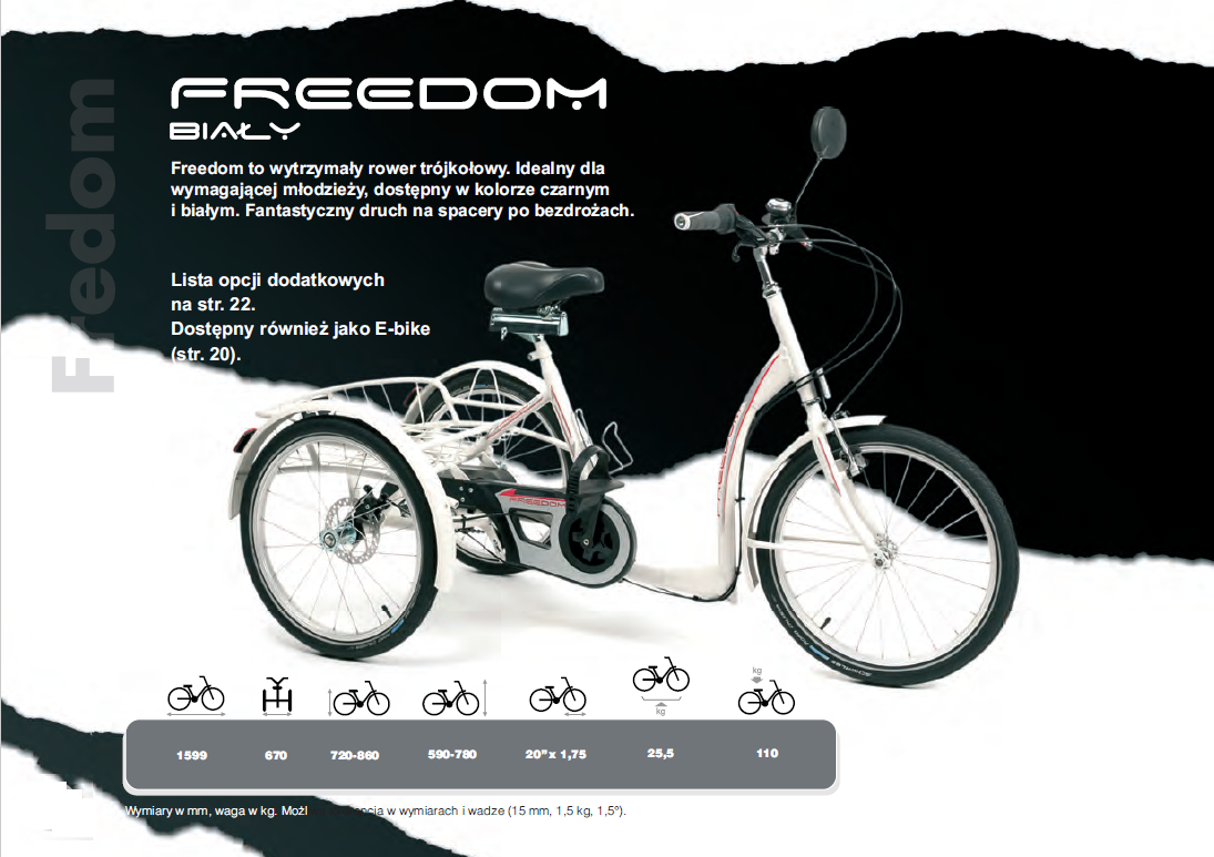 Nie ma lepszego wrażenia kiedy można znowu poczuć smak wycieczki, która dla osób z zaburzeniami ruchu wydawać by się mogło, że się skończyła bezpowrotnie. Nic z tych rzeczy , dzięki rowerowi FREEDOM można znowu czerpać radość z wypadów poza miasto. Rower jest standardowo wyposażony w opony firmy SCHWALBE z paskiem odblaskowym na obwodzie, co sprawia, że osoba jadąca wieczorem jest widoczna. Nisko zawieszona rama tuż nad ziemią sprawia, że wsiadanie i zsiadanie z roweru jest dużo łatwiejsze.