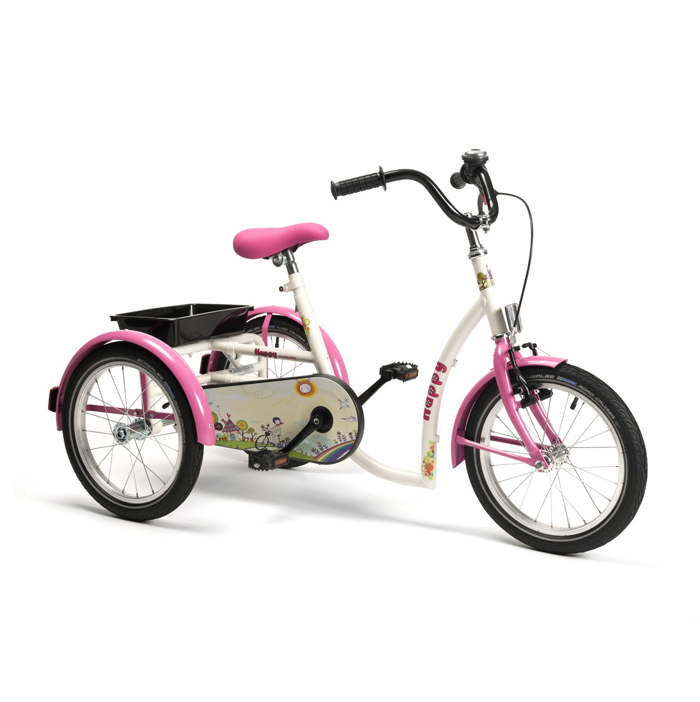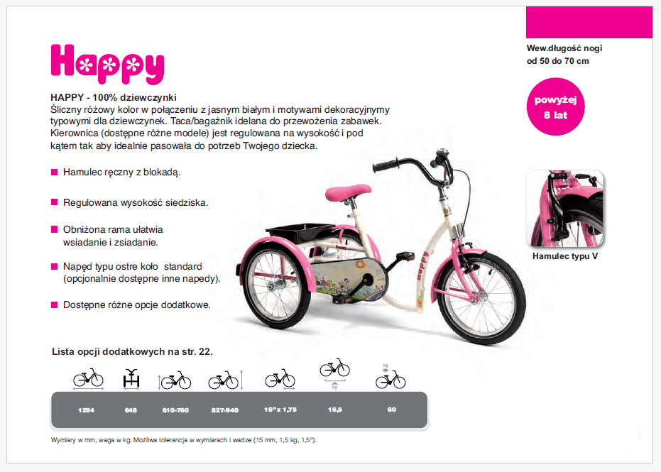 • Happy to rehabilitacyjny rowerek trójkołowy dedykowany dla dziewczynek – sugerują to kolorystyka oraz ozdoby