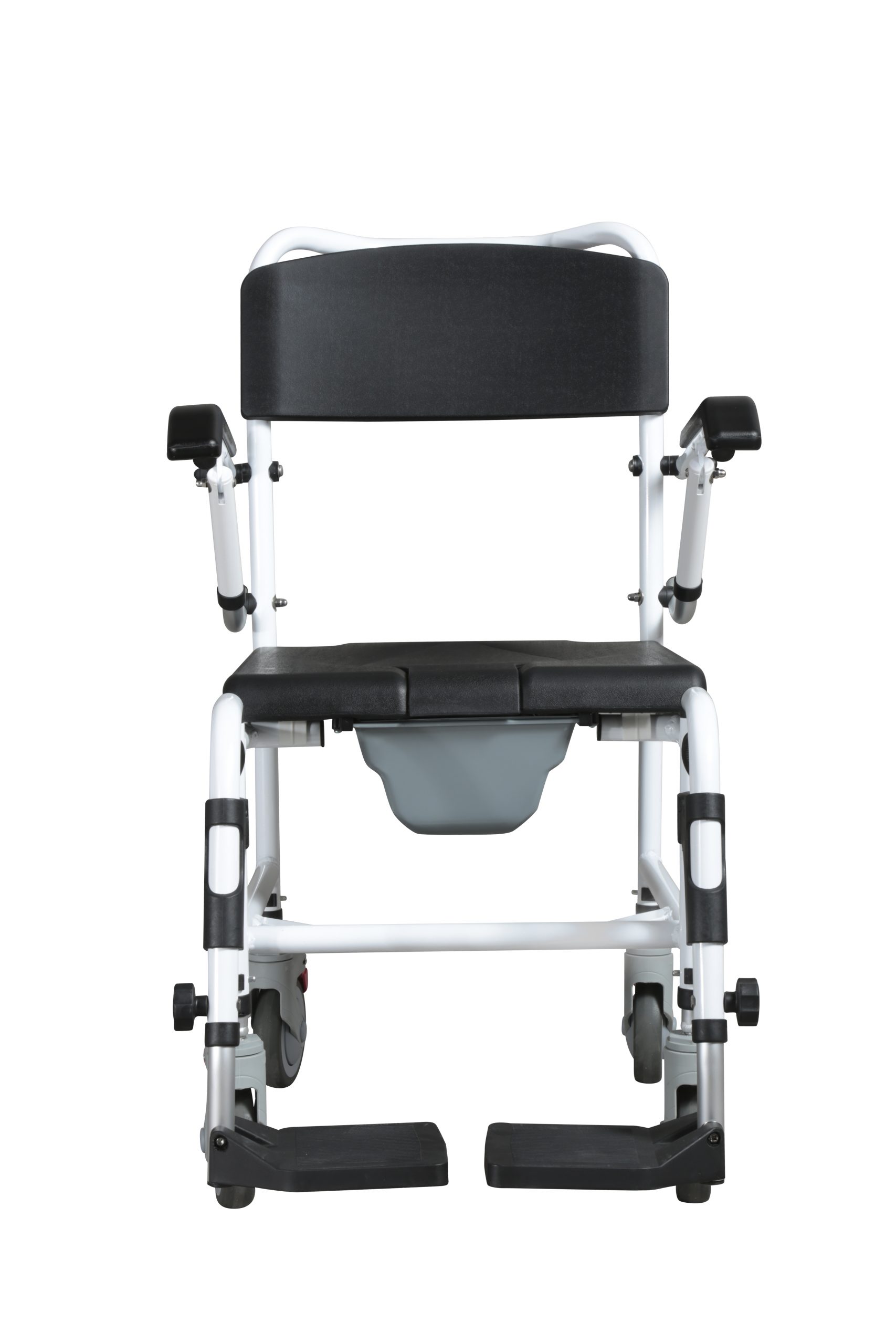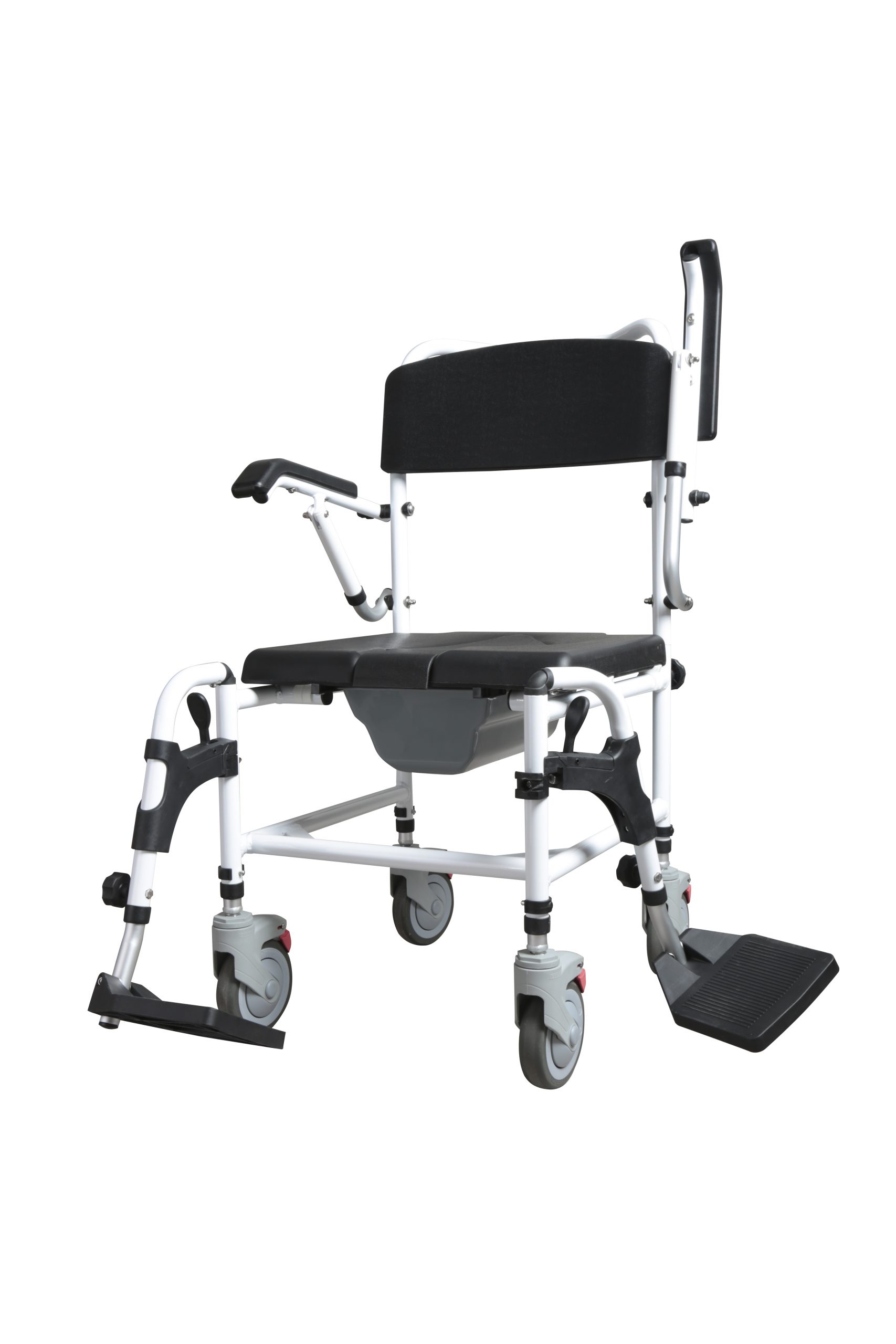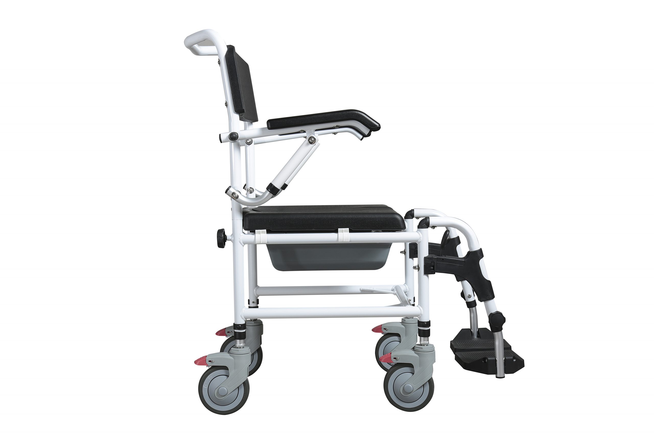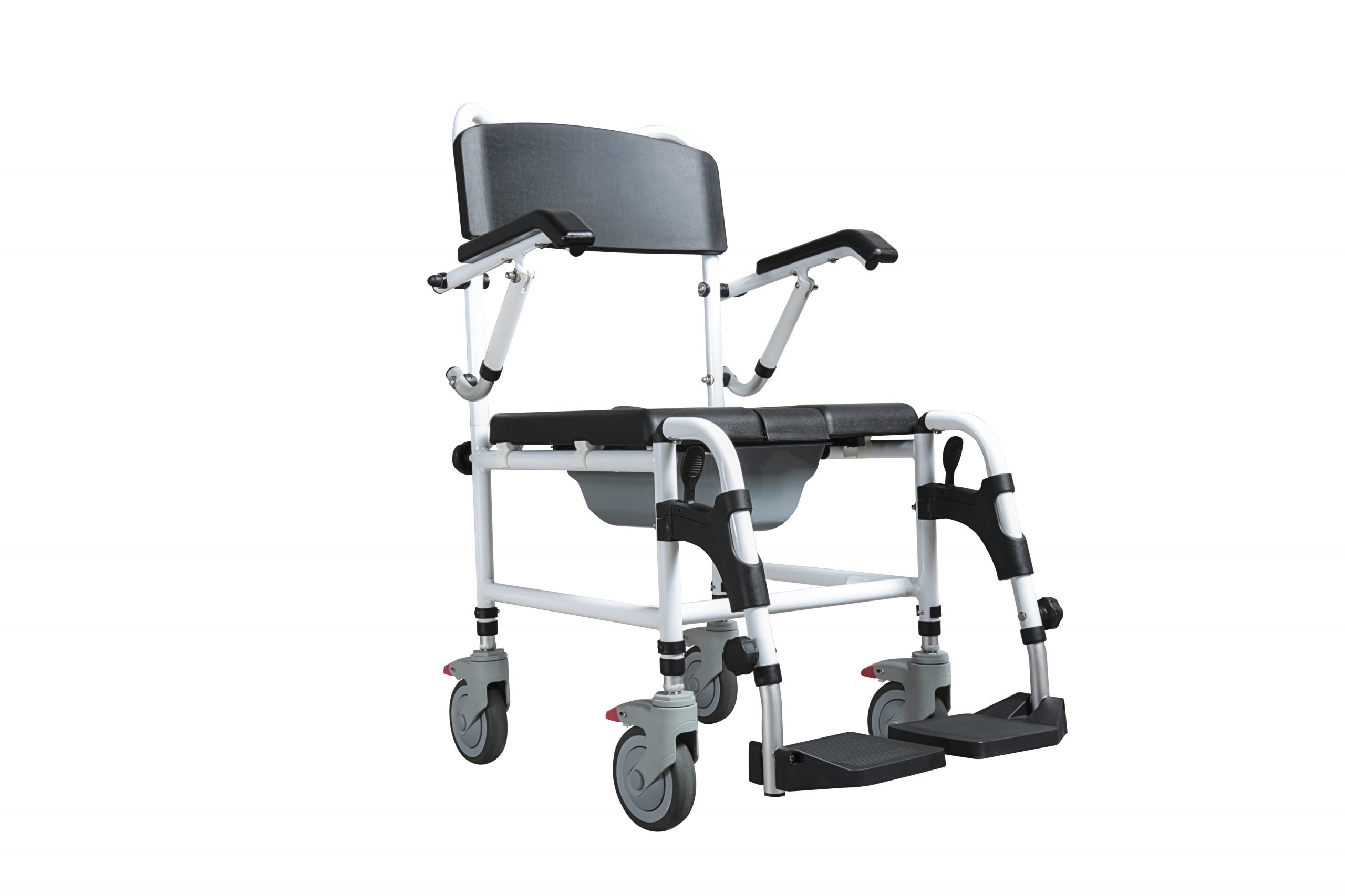 - MASTER-TIM – Prysznicowo-toaletowy wózek transportowy 3w1 – MASTER-TIM wykonany jest z aluminiowej, malowanej proszkowo ramy. Posiada uchylne podłokietniki umożliwiające łatwe wsiadanie i zsiadanie osobom o obniżonej sprawności ruchowej. Wyposażony w siedzisko z klinem wykonane z PU, cztery obrotowe koła 5” z hamulcami, uchylne podnóżki i pojemnik sanitarny. Konstrukcja wózka umożliwia najeżdżanie na sedes