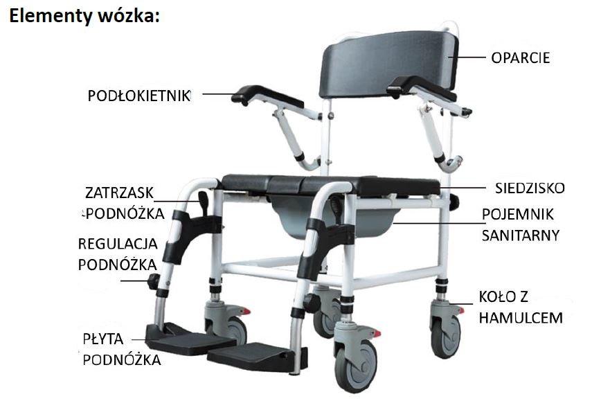 - Wózek pełni funkcję prysznicową, transportową i toaletową dzięki wyposażeniu w pojemnik sanitarny pod siedziskiem i cztery obrotowe koła. Ma na celu ułatwienie czynności higienicznych i fizjologicznych użytkownika. Szczególnie zalecany dla osób mających problemy z poruszaniem się wywołane przez: paraliż, nadwagę, zwyrodnienia lub deformację kończyn, zwyrodnienia czy uszkodzenia stawów, uszkodzenie kończyn lub ich amputacje, choroby serca i naczyń, zaburzenia krążenia.
