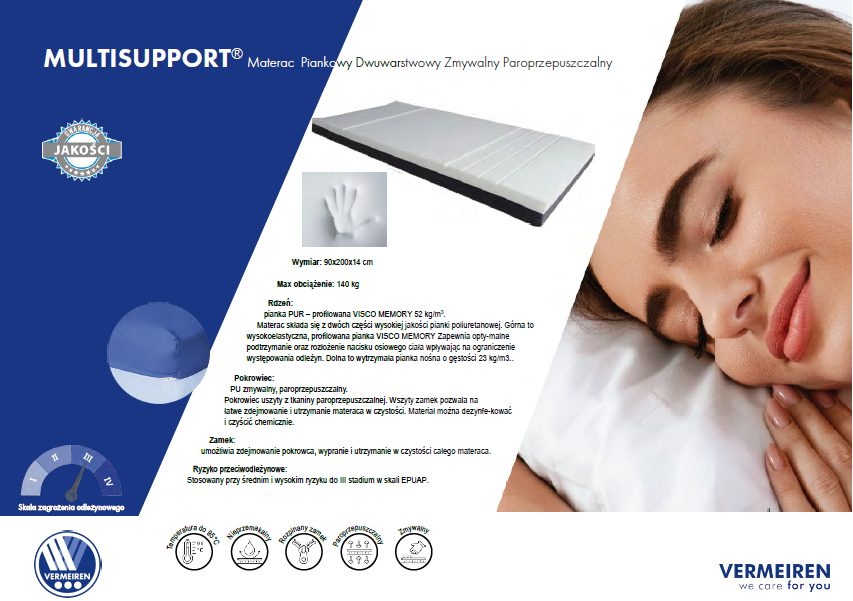 - MULTI SUPPORT składa się z dwóch części wysokiej jakości pianki poliuretanowej. Górna to wysoko elastyczna , profilowana z pamięcią pianka o gęstości 52 kg/m3 , dzięki której materac jest przeznaczony dla osób ważących nawet 140 kg. Zapewnia optymalne podtrzymanie oraz rozłożenie nacisku osiowego ciała wpływając na ograniczenie występowania odleżyn. Dolna to wytrzymała pianka nośna , która stanowi odpowiednia bazę stabilizującą.