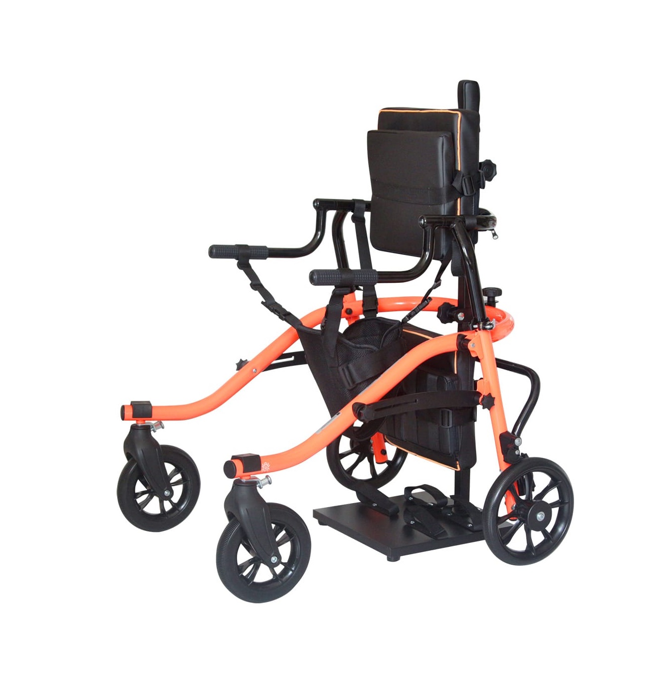 - Miękkie, regulowane stabilizatory na wysokości tułowia, bioder i kolan zapewniają wygodę. Zapinane na rzepy pasy stabilizatorów oraz platformy utrzymują dziecko w bezpiecznej pozycji