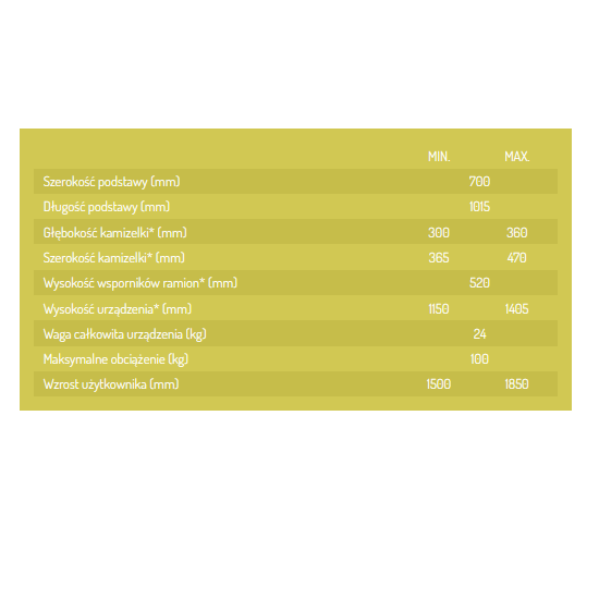 - duży zakres regulacji na wysokość, szerokość oraz głębokość dzięki czemu urządzenie dopasowane jest maksymalnie do Użytkownika