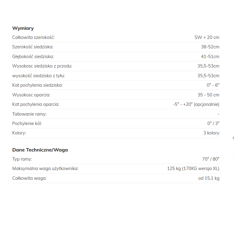 - Regulowana głębokość siedziska od 41 do 51 cm. Regulacja środka ciężkości tylnego koła do 7,5 cm, co umożliwia łatwe obracanie i lepszą charakterystykę działania (w standardzie)