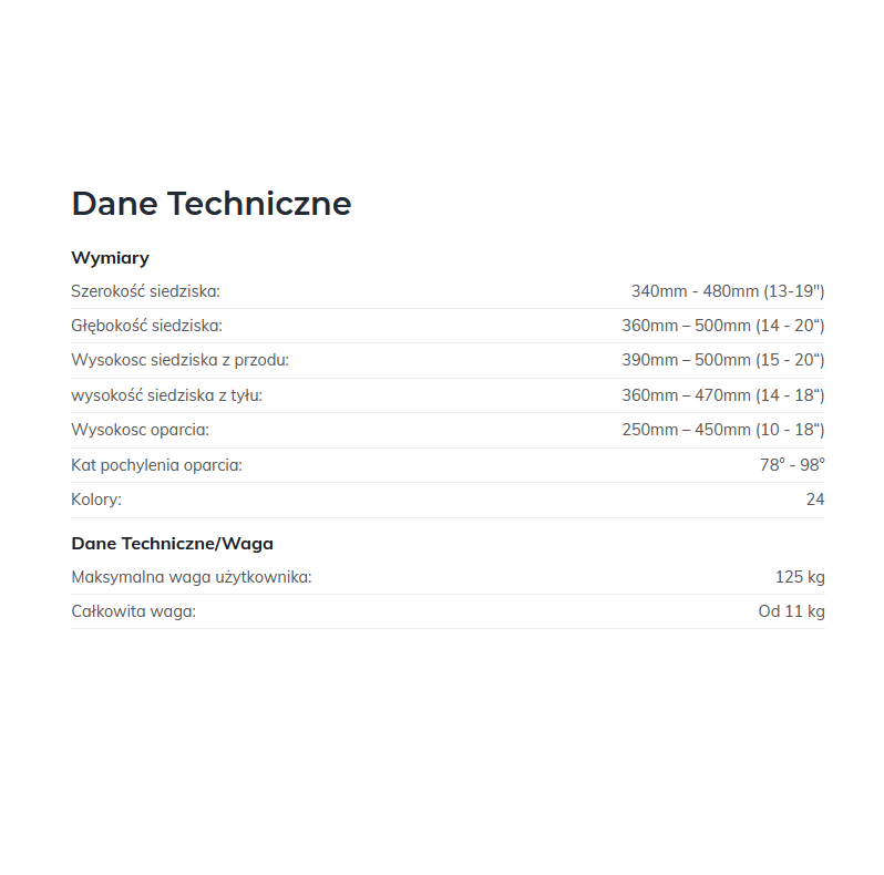 - Pochylenie kół tylnych w zakresie od 0° do 4°, 4 położenia środków ciężkości (od bardzo dynamicznego – 83 mm, do pasywnego – 23 mm).