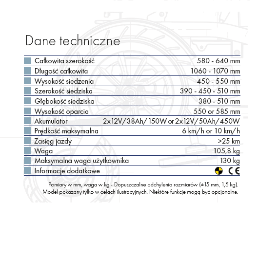 - Maksymalna szerokość wózka to tylko 58 cm co powoduje , że w ciasnych korytarzach , przy przejazdach przez wąskie drzwi wózek zachowuje się swobodnie. Jednocześnie inteligentne rozwiązania konstrukcyjne, zastosowanie stosunkowo mocnych baterii 50 Ah gwarantuje płynną i stabilną jazdę